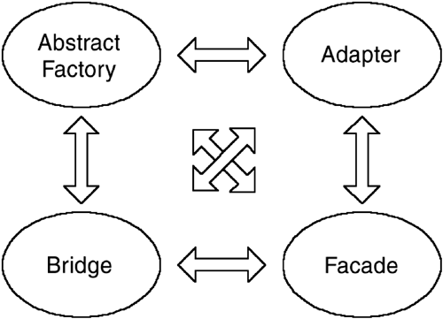When determining which patterns create the context for others in my problem domain, I apply an easy technique: I look through all possible pairings of the patterns, taken two at a time. In this case, there are six possible pairings, as shown in Figure 12-2.