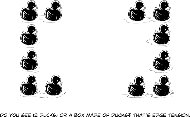 In the second image, I have arranged the ducks so they appear to form the corners of a box. You could see 12 ducks, or four groups of 3 ducks, but your mind really wants to see the box, so it does. Furthermore, now we can put things “inside” the box (like more ducks!), or in the spaces between the corners. Similar to line tension, edge tension brings ...