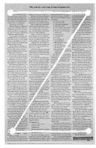 Let’s start with the most boring design I can imagine: an entire newspaper page of solid text. All one story. No headlines. No images. No breaks or pull quotes; just text, in even columns, from corner to corner.