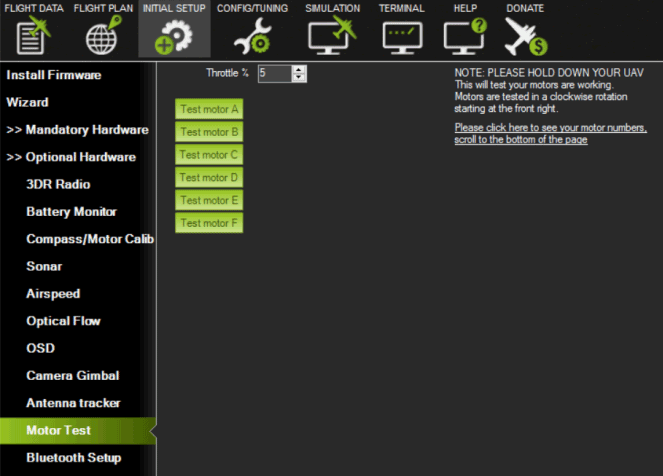 Back in Mission Planner (while connected to your powered-on drone), go into Initial Setup, and under the Option Hardware section you'll find Motor Test. It looks like the following screenshot: