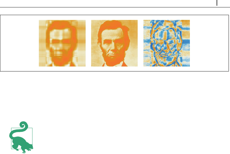 左)、50 個(中央)の特異値で再構築されたリンカーンの顔写真と k = 50 のときの誤差