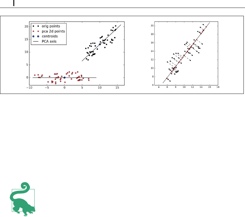 成分の値は、適切な軸に個々の点を射影して求める(右)
