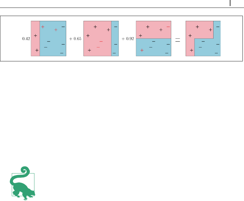 の分類器は誤分類をしているが(赤で表示)、最終的な分類器はすべての点を正しく分類する