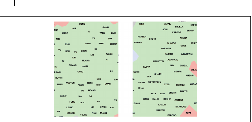 る。左側の拡大図は中国/南アジア系の姓、右側の拡大図はインド系の姓のクラスタを示してい