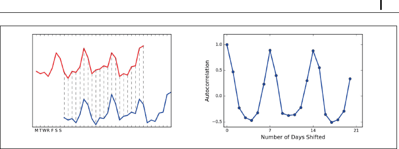 系列データの周期的なトレンド(左)は、元データと時間軸を少しずらしたものとの相関を調