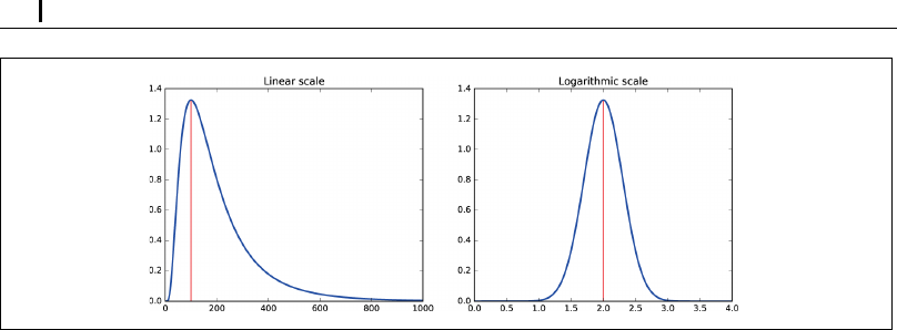 図 2 -13 歪んだデータ分布(左)は、軸を対数軸にするとベル型に近くなることが多い(右)