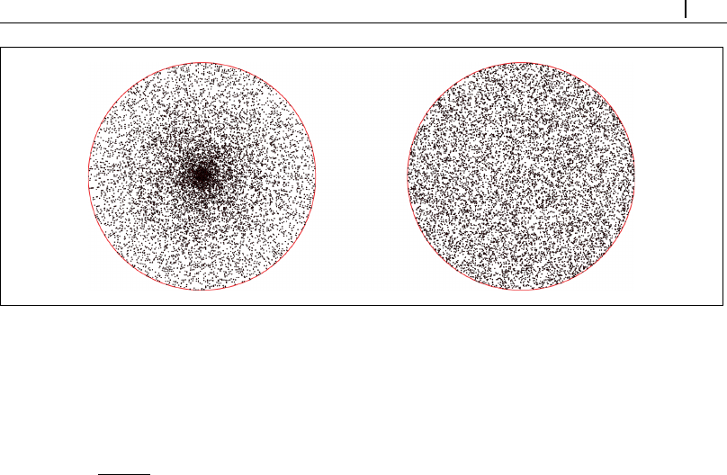偏る(左)。それに対し、モンテカルロ法で点をサンプリングすると、円の中の点が一様に散らば