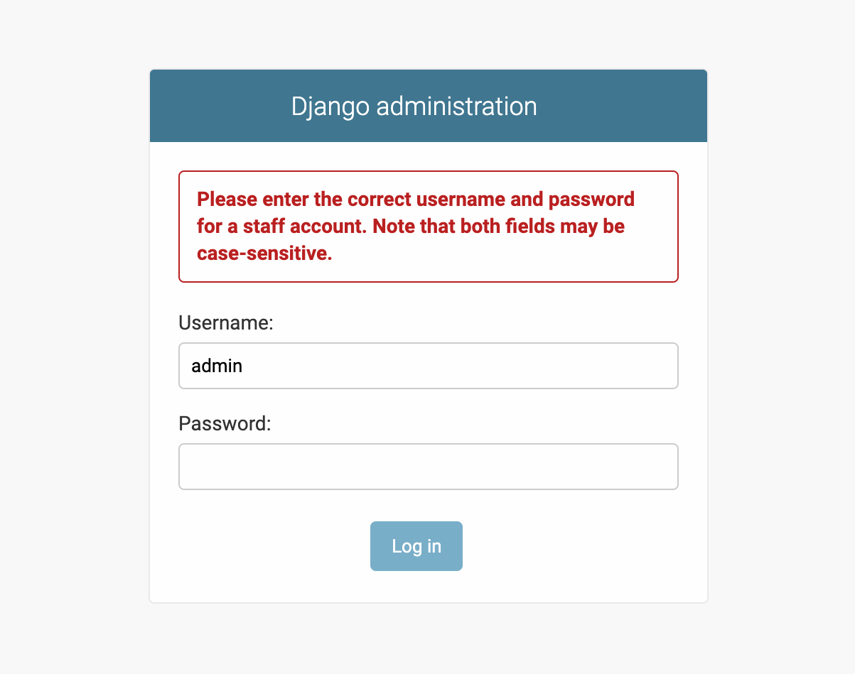 If you go to the default administration URL, http://127.0.0.1:8000/en/admin/, you will see the login screen, but whatever you enter will be described as an invalid password: