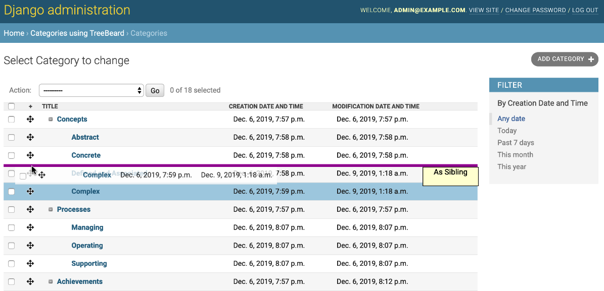 The administration interface for the categories will have one of two modes, dependent upon the tree implementation used. For Materialized Path and Nested Sets trees, an advanced UI is provided, as seen here: