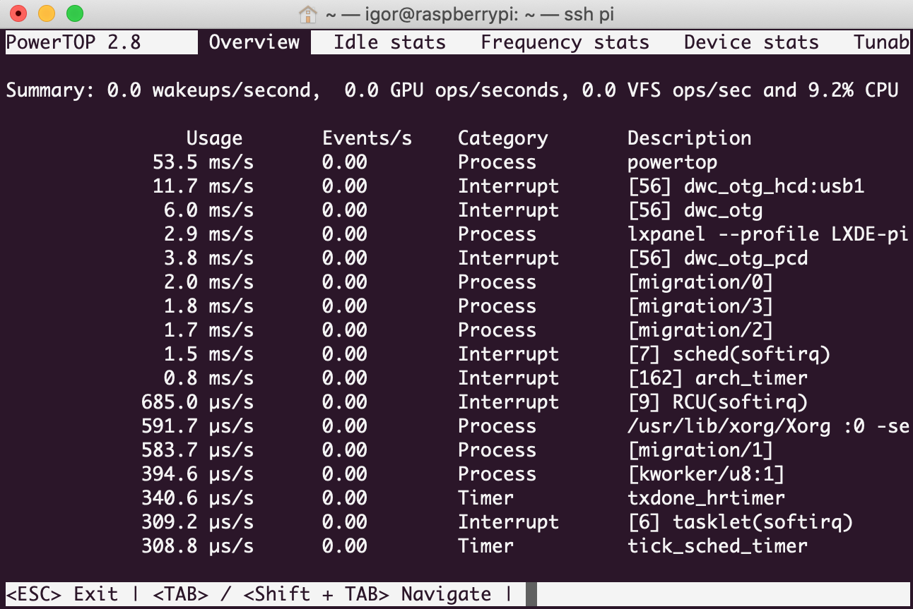 PowerTOP is a tool created by Intel to diagnose power issues in a Linux system. It is part of the Raspbian distribution and can be installed using the apt-get command: