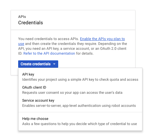 - To do this, we need to create a new Service account key. From the left-hand-side menu of the Google Cloud Console, select APIs & Services | Credentials. Then click on the Create credentials dropdown and select Service account key as shown in the following screenshot: