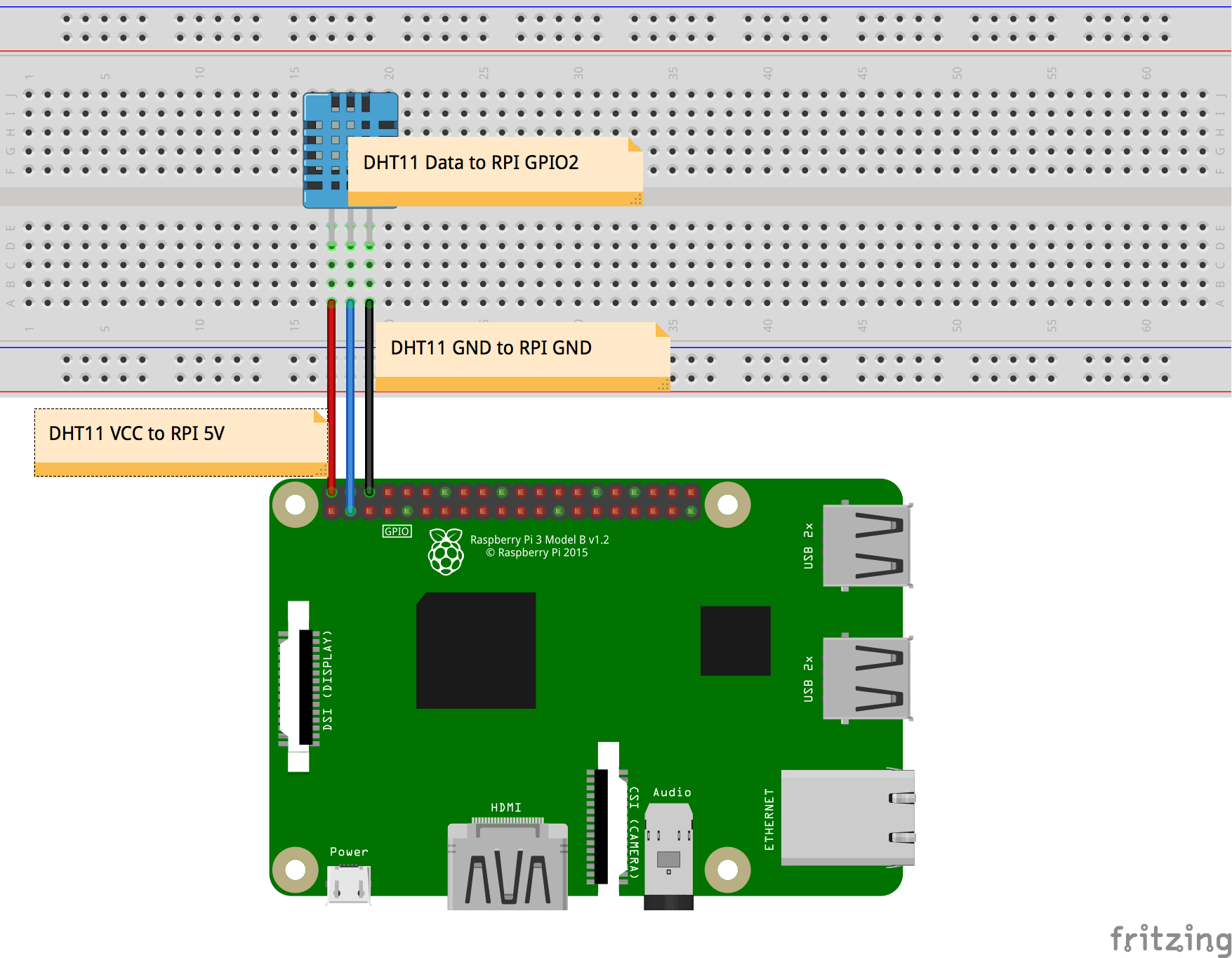 - Connect the Raspberry Pi 3 and DHT11 sensor as shown in the following diagram: