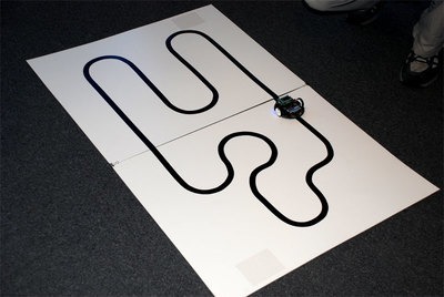 - Then, place the robot on the dark line of the race track and turn on the power button. The robot will start to follow the dark line (Figure 5.12). Line-following robots are very susceptible to light and ground texture changes and may show unexpected line-following behaviors. If so, adjust the contrast and lighting on the environment: