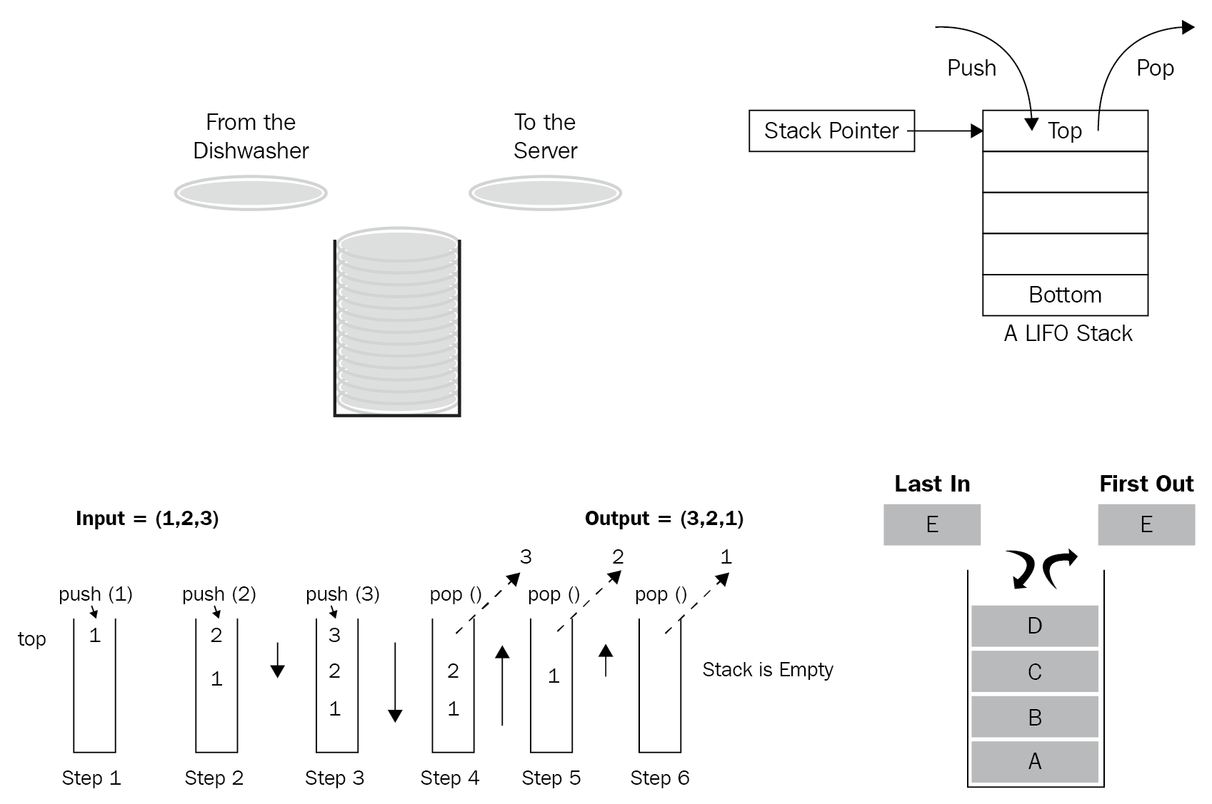 Figure 2.10 illustrates such a stack as a last-in-first-out (LIFO) process with its crucial operations like pop and push: