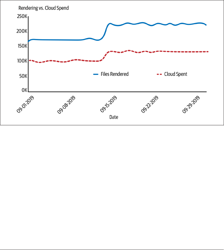 中,你将跟踪渲染文件的成本。云成本在增加,但渲染的作业数量却没有增加。