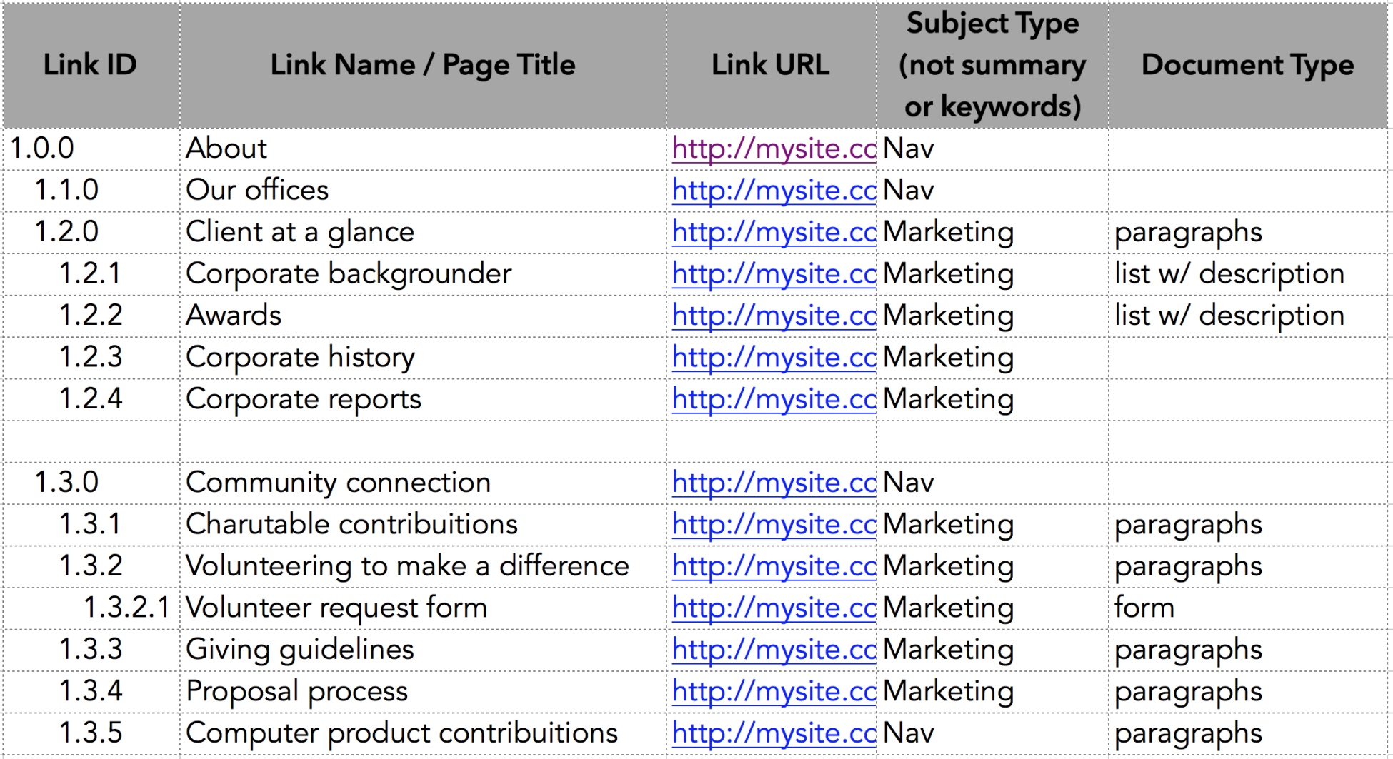 It consists of a mapping of all the pages (predicted or existing) and the content of each one. In this way, we can see all the content holistically, which will be easy to organize the information (taxonomy, controlled vocabulary, and so on), to identify duplicate content (very common in sites with large amounts of information) and in the future to facilitate its finding: