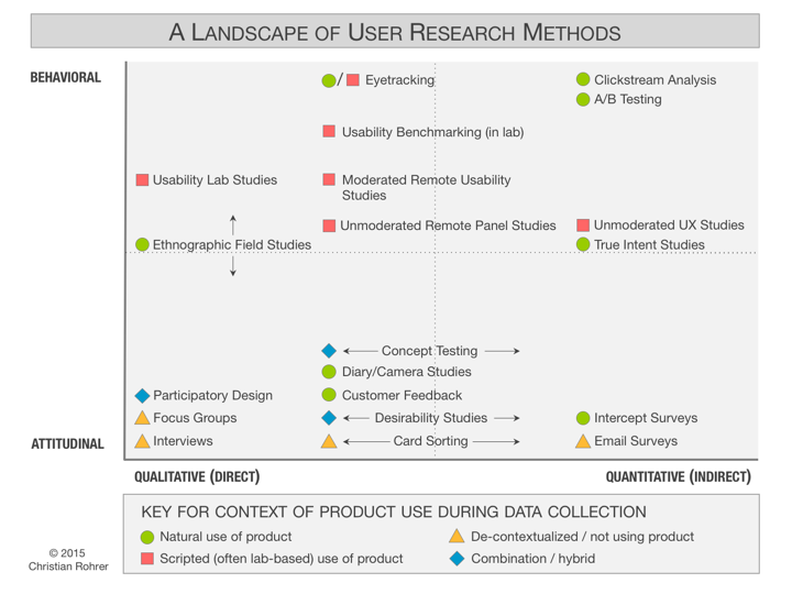 The UX expert Cristian has organized these different methodologies into a chart, A Landscape of User Research Methods, to help us to better understand them: