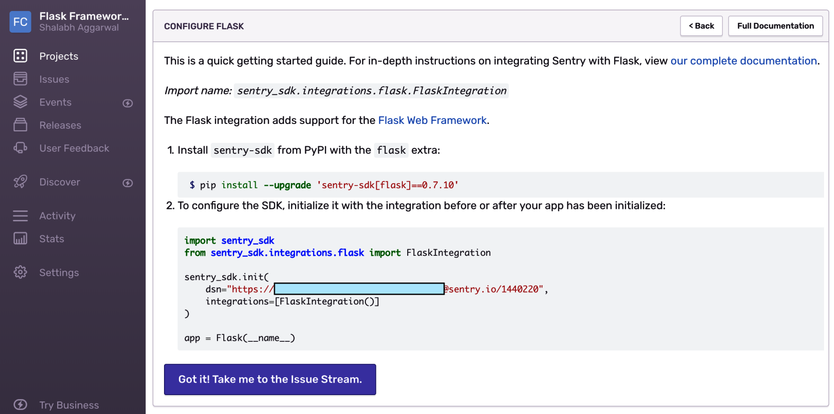 This would be followed by another screen that will show the steps on how to configure your Flask application to send events to the newly created and configured Sentry instance. This is shown in the following screenshot: