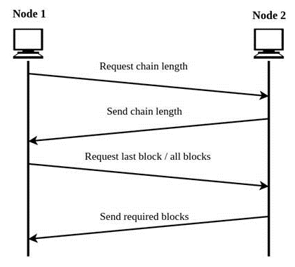 The node sends a chain length or last block query message after connecting to the peer. Requesting the chain length is equivalent to requesting the last block to identify its index. If the received block cannot be appended to the local blockchain due the hash mismatch, then the node sends a message to its peer asking it to send all the blocks. The node can also broadcast ...
