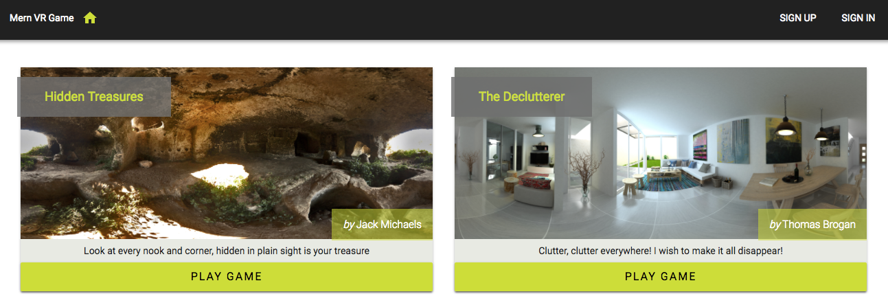 The MERN VR Game web application will be developed by extending the MERN skeleton and integrating VR capabilities using React 360. It will be a dynamic, web-based VR game application, in which registered users can make their own games, and any visitor to the application can play these games. The home page of this application will list the games on the platform, as shown in the following screenshot: