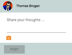 The NewPost component that we added in the Newsfeed component will allow users to compose a new post containing a text message and, optionally, an image, as shown in the following screenshot: