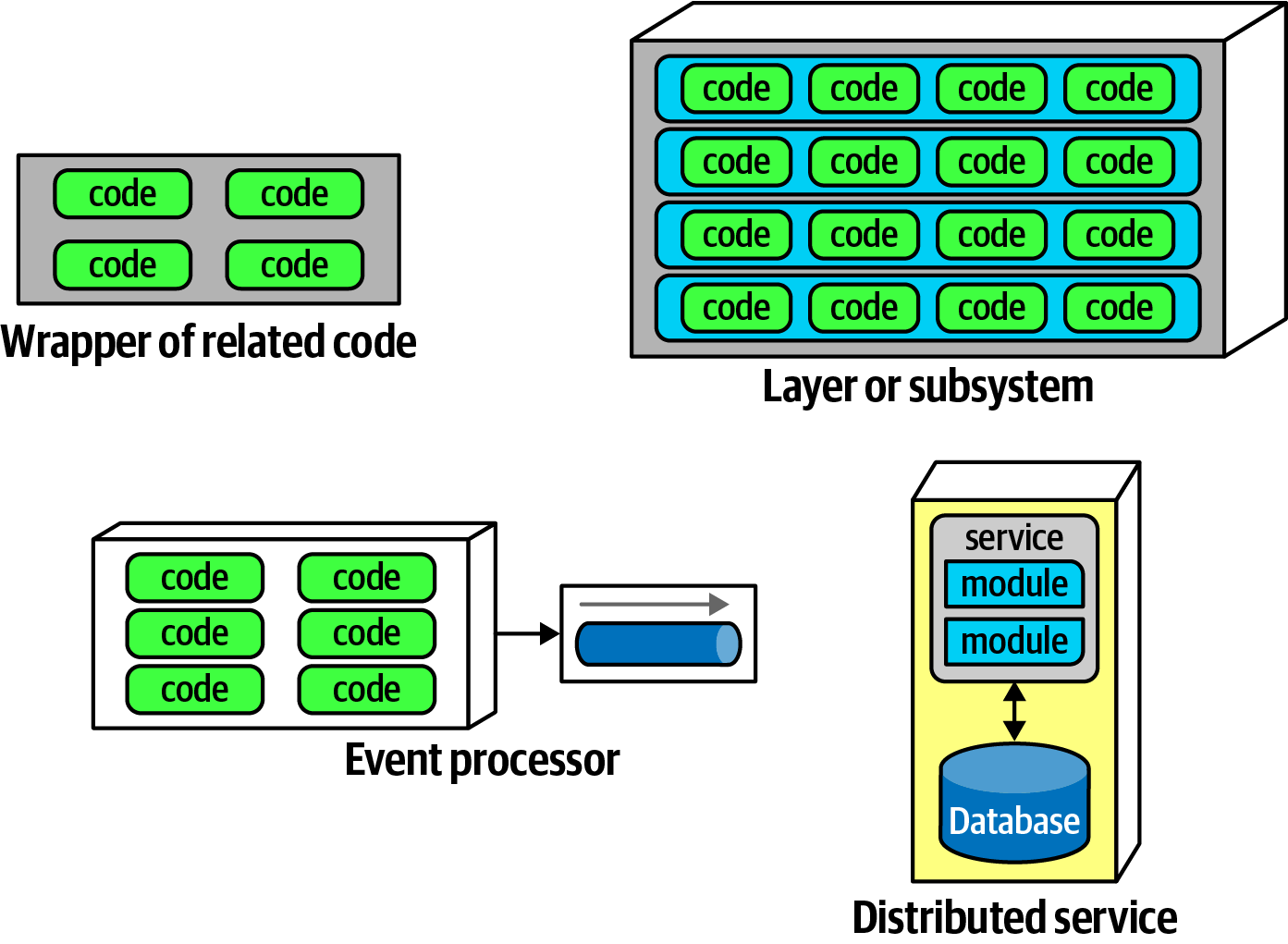 Components offer a language-specific mechanism to group artifacts together, often nesting them to create stratification. As shown in Figure 8-1, the simplest component wraps code at a higher level of modularity than classes (or functions, in nonobject-oriented languages). This simple wrapper is often called a library, which tends to run in the same memory address as the calling code and communicate via language function call mechanisms. Libraries are usually compile-time dependencies (with notable exceptions like dynamic link libraries [DLLs] that were the bane of Windows users for many years).