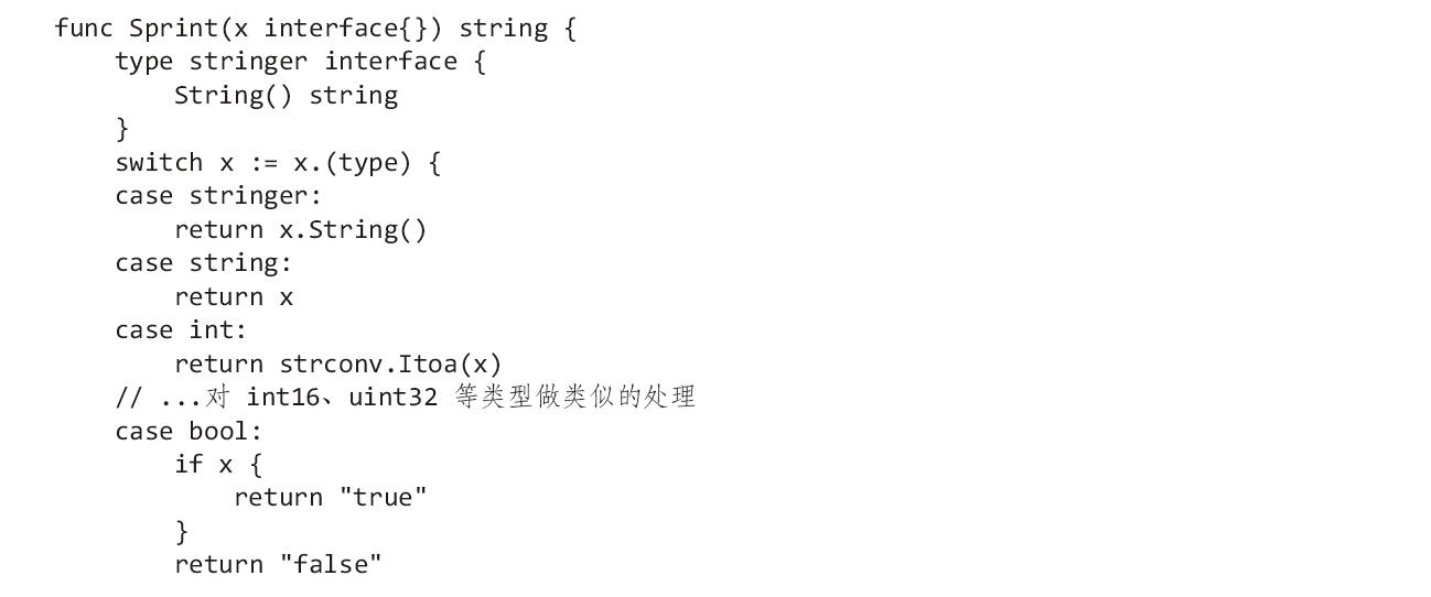 一个熟悉的例子是fmt.Printf中的格式化逻辑,它可以输出任意类型的任意值,甚至是用户自定义的一个类型。让我们先尝试用我们已学到的知识来实现一个类似的函数。为了简化起见,该函数只接受一个参数,并且与fmt.Sprint一样返回一个字符串,所以我们称这个函数为Sprint。