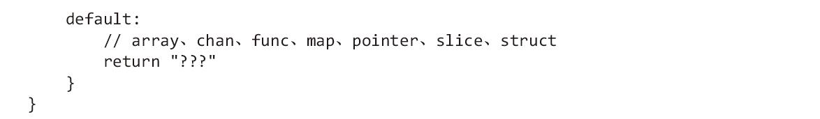 我们先用一个类型分支来判断这个参数是否定义了一个String方法,如果已定义则直接调用它。然后添加一些switch分支来判断参数的动态类型是否是基本类型(比如string、int、bool等),再对每种类型采用不同的格式化操作。