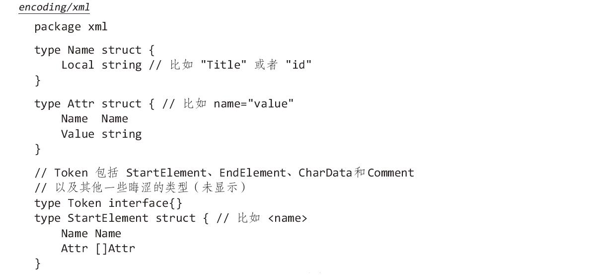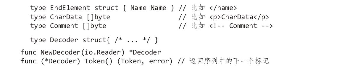 4.5节展示了如何用encoding/json包的Marshal和Unmarshal函数来把JSON文档解析为Go语言的数据结构。encoding/xml包提供了一个相似的API。当需要构造一个完整文档树的结构时这很方便,但对于很多程序这是不必要的。encoding/xml还为解析API提供了一个基于标记的底层XML。在这些API中,解析器读入输入文本,然后输出一个标记流。标记流中主要包含四种类型:StartElement、EndElement、CharData和Comment,这四种类型都是encoding/xml包中的一个具体类型。每次调用(*xml.Decoder).Token都会返回一个标记。