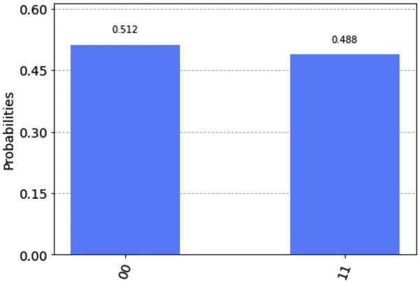 fromqiskitimportQuantumCircuit,Aer,transpilefromqiskit.visualizationimportplot_histogramqc=QuantumCircuit(2)qc.h(0)qc.cx(0,1)qc.measure_all()backend=Aer.get_backend("aer_simulator")tqc=transpile(qc,backend)job=backend.run(tqc,shots=1000)result=job.result()counts=result.get_counts(tqc)plot_histogram(counts)