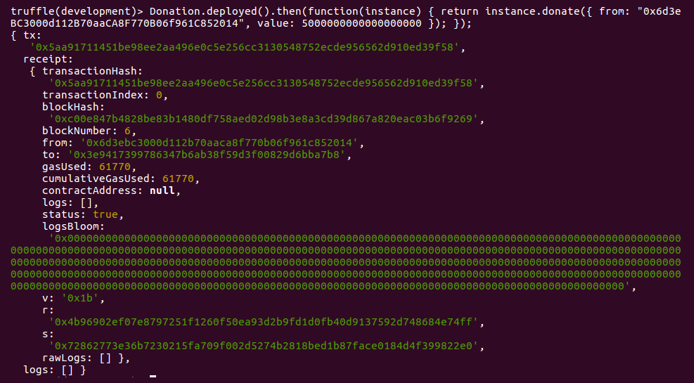 truffle(development)> Donation.deployed().then(function(instance) { return instance.donate({ from: "0x6d3eBC3000d112B70aaCA8F770B06f961C852014", value: 5000000000000000000 }); });