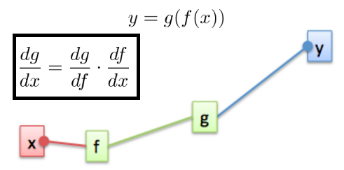 The backpropagation algorithm is really just an example of the trusty chain-rule from calculus. It states how to find the influence of a certain input, on systems that are composed of multiple functions. So for example in the image below, if you want to know the influence of x on the function g, we just multiply the influence of f on g by the influence of x on f: