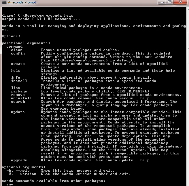 After we launch Anaconda Prompt and issue conda help, we will see the following output: