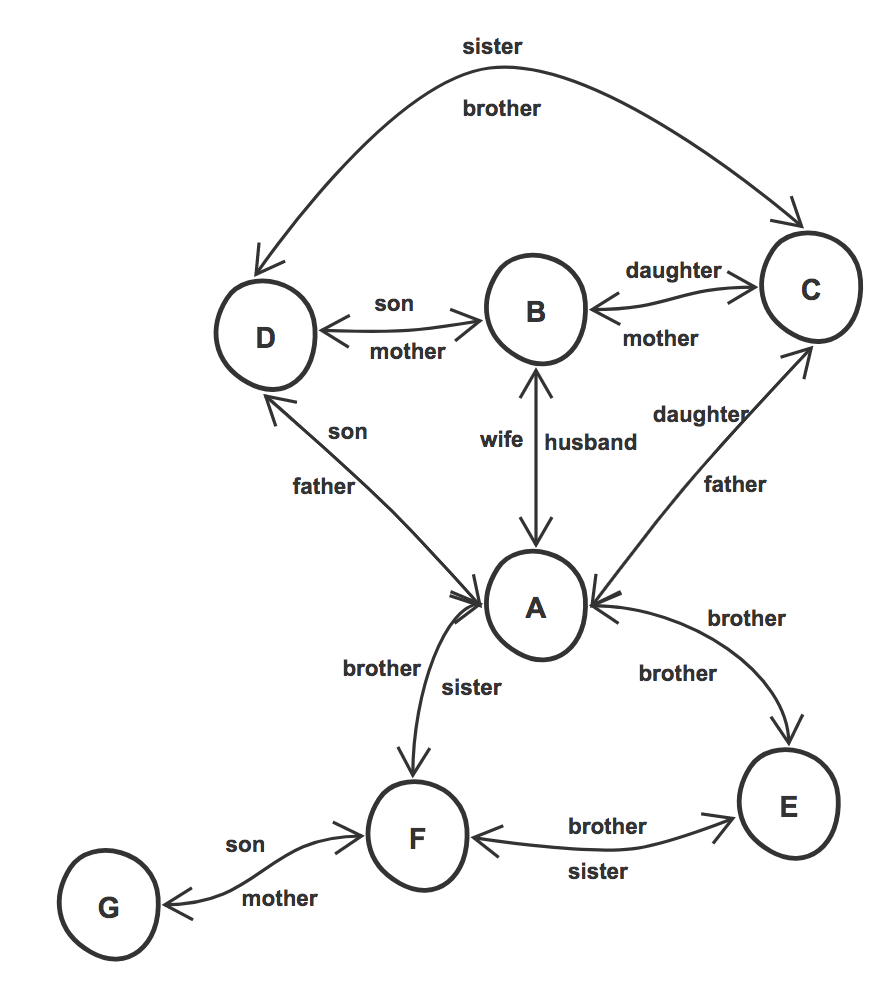 You can note from the preceding diagram that we have a small family in which nodes A, E, and F are siblings. A is married to B with nodes C and D as their ...