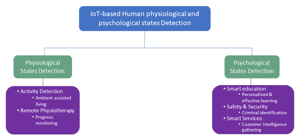 In recent years, human physiological and psychological state detection have been used in many application domains to improve existing services and/or offer new services. IoT, combined with DL techniques, can be used in applications to detect human physiological and psychological states. The following diagram highlights a few key applications of these detection approaches: