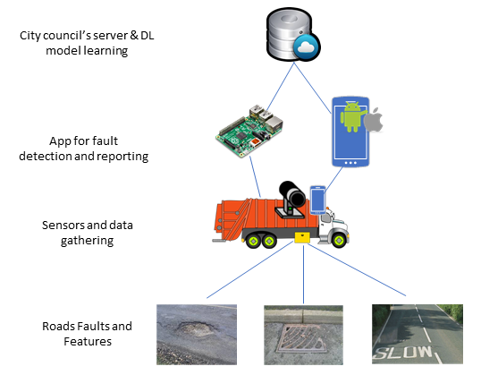 - Sensors and data gathering: The selection of sensors for data gathering depends on the assets and fault types. If we use a smartphone as the edge-computing device, its camera can be used for sensing and data gathering about road faults. On the contrary, if we use Raspberry Pi as the edge-computing device, we need to use an external camera, as there is no built-in camera within the Raspberry Pi. The preceding diagram shows the Raspberry Pi and camera used for the use case ...