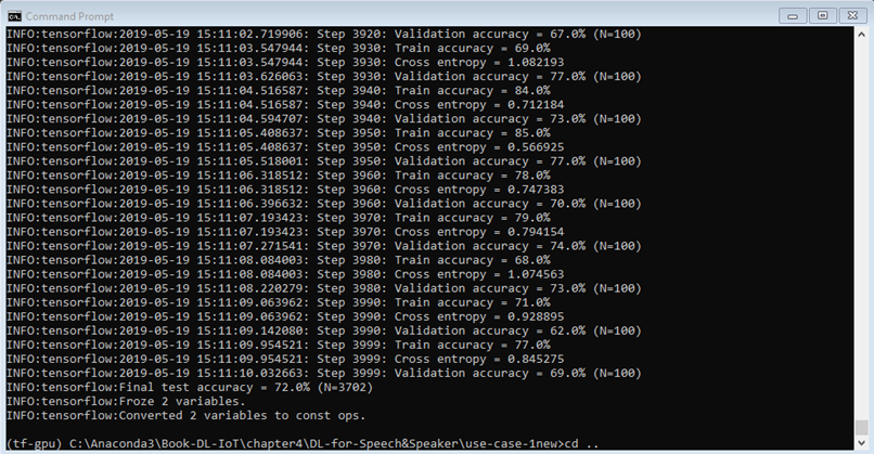 The following screenshots present the evaluation results of Mobilenet V1 on a speech command dataset (customized to only five commands, including on, no, off, yes, and stop). Note that on is considered to be switch on the light for use case one due to the lack of a real dataset: