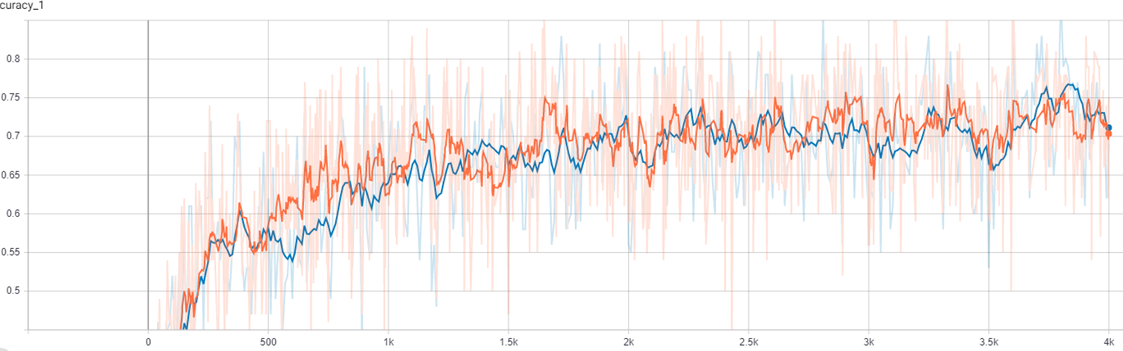 The following screenshot was generated from the TensorBoard log files. The orange line represents the training and the blue one represents the validation accuracy of the Mobilenet V1 on the command dataset:
