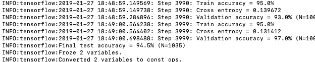 All the evaluation performances of use case one are presented in the following screenshots. The following six screenshots present the training, validation, and testing performances of Incentive V3 and Mobilenet V1 models on the two sets of data. The first three screenshots present the results generated in the terminal after retraining the models, and the last three screenshots are generated from the TensorBoard.