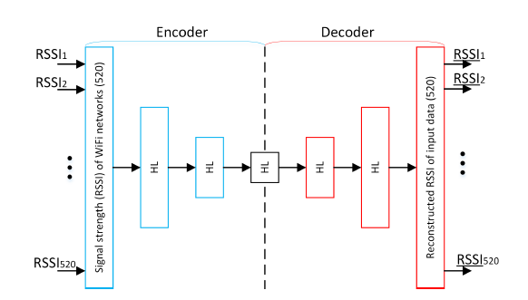 The AE classifier we will be using will have an AE part consisting of an encoder and a decoder. The following AE architecture is used to determine the floor and building location where the Wi-Fi is located. The input to the AE are signal strengths detected in a scan. Then, one value for each visible network is considered an RSSI record. The output of a decoder is the reconstructed input from the reduced representation, as shown in the following diagram (source: Low-effort place recognition with Wi-Fi fingerprints using deep learning, Michał N. et al., arXiv:1611.02049v1):