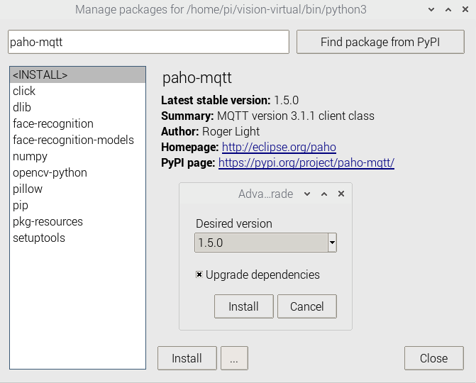 - Type in paho-mqtt in the search box and click on the Find package from PyPI button.