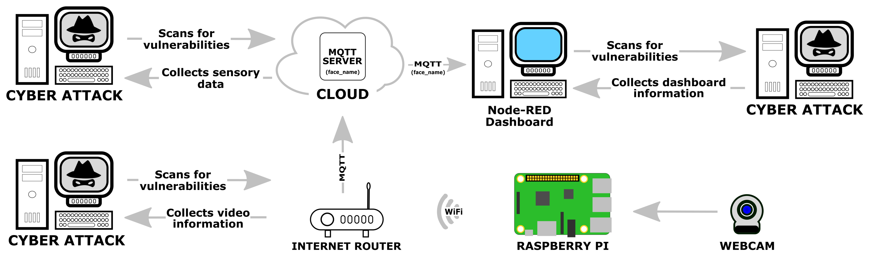 Vulnerabilities in our internet-facing interfaces may be exploited by cyber criminals. These vulnerabilities include using default passwords and out-of-date software updates. In the following diagram, we can see the vulnerabilities of the internet-facing interfaces of the smart doorbell application we built in the previous chapter: