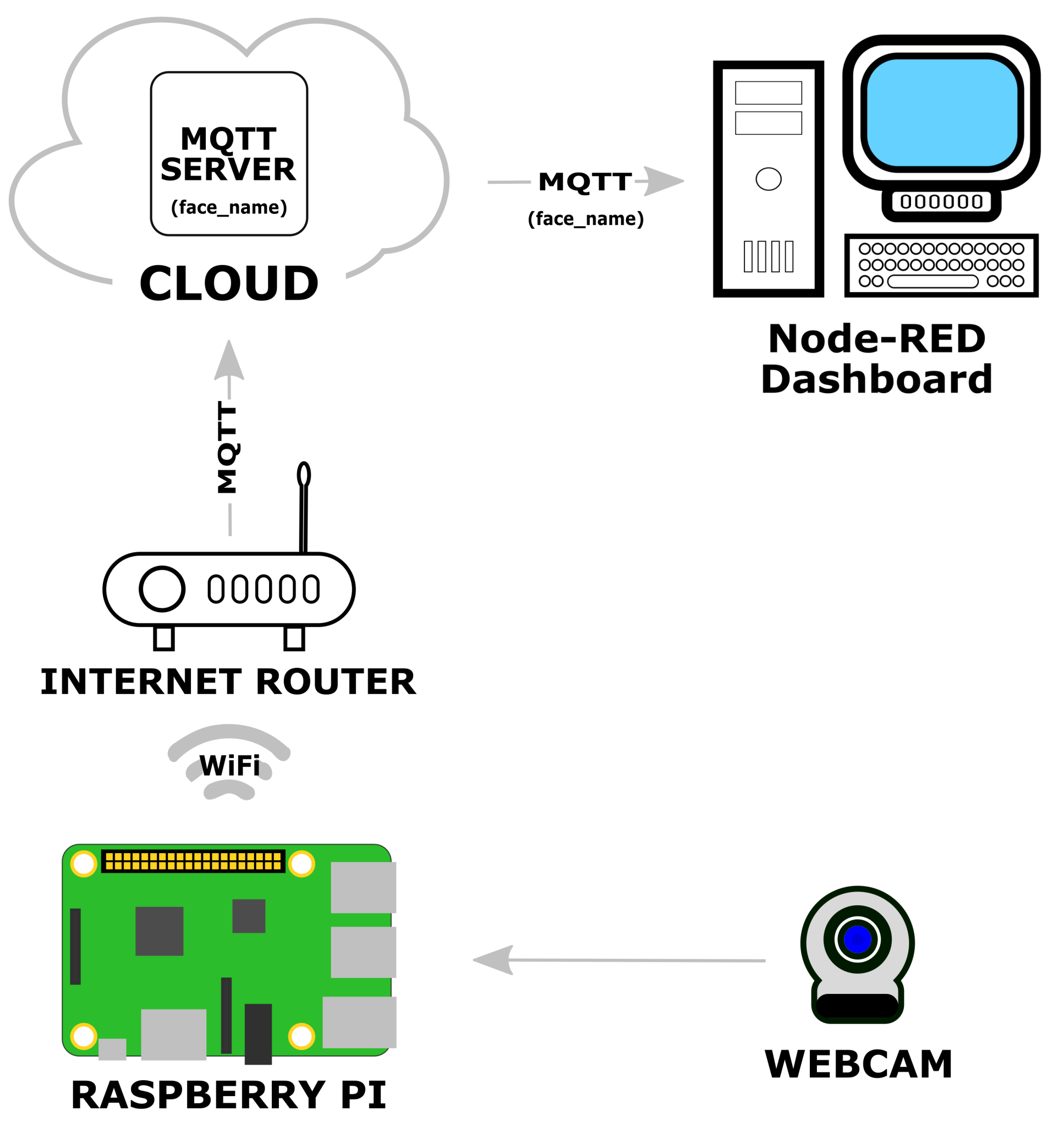 A webcam connected to the Raspberry Pi will provide video frames for analysis. The Raspberry Pi will connect to an internet router via Wi-Fi where an MQTT signal will be published to the cloud. A subscriber on the other end of the MQTT server will receive a message and will display the results on a Node-RED ...