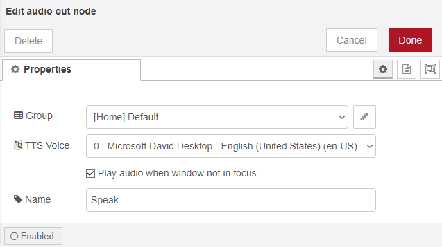 - Double-click on the audio out dashboard component to enter the Edit audio out node dialog box.