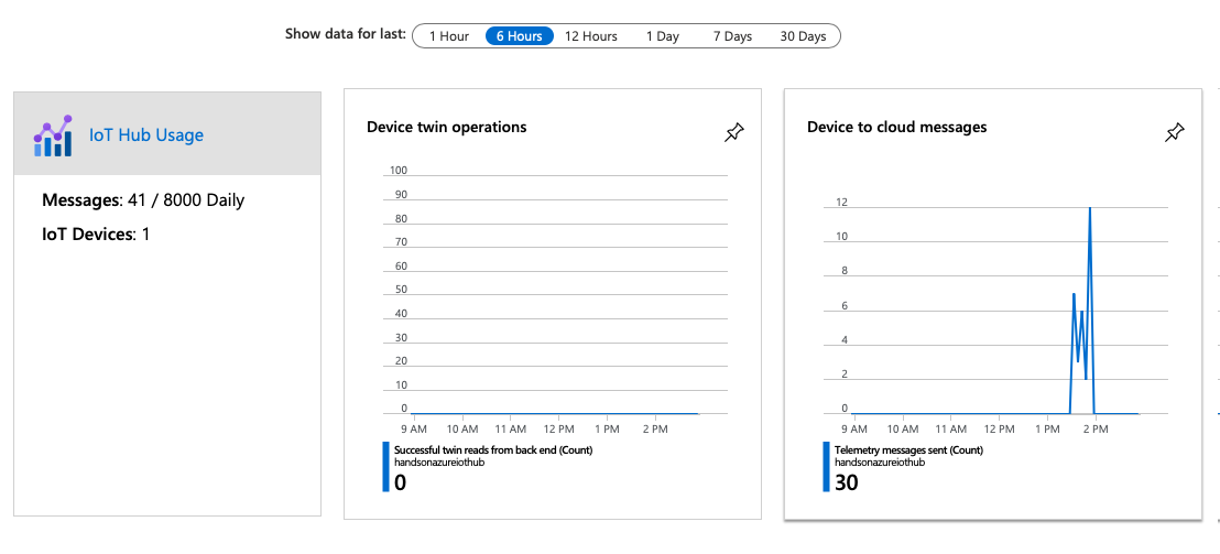 - The pin icons on the Device twin operations and Device to cloud messages charts allow for pinning these charts to the Azure Dashboard. Click on the pin for the Device to cloud messages chart.