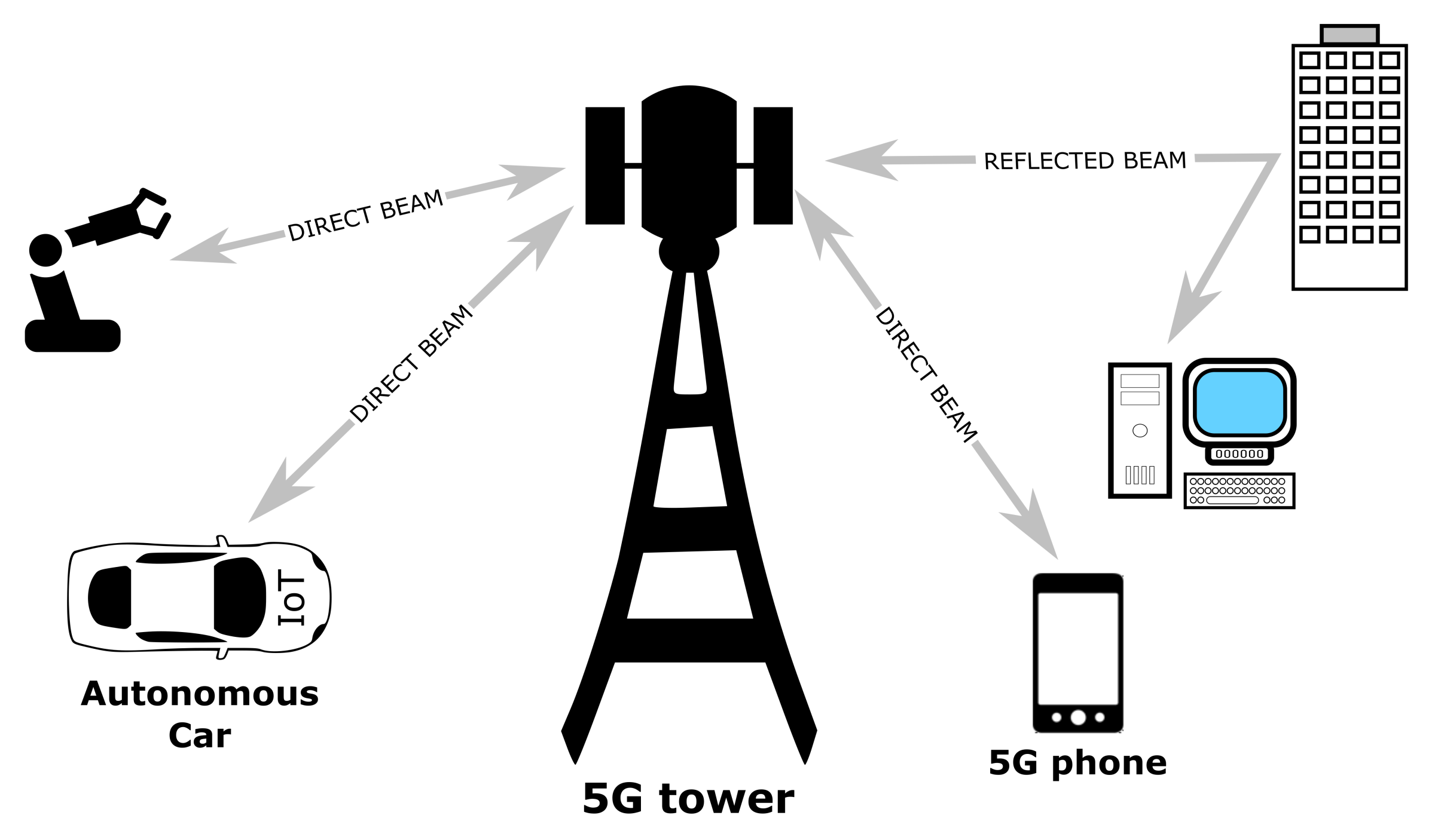5G represents the latest in cellular network technology. For IoT solutions, it incorporates frequencies as high 95 GHz (the EHF frequency band). Transmission is divided up among small cell towers using multiple antennas. Due to the fact that small wavelengths have shorter ranges than larger wavelengths (lower frequencies) a method called beamforming is incorporated into 5G, as shown in the following diagram: