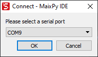 - Select the port the Maix K210 is connected to and click on the OK button, as shown in the following screenshot: