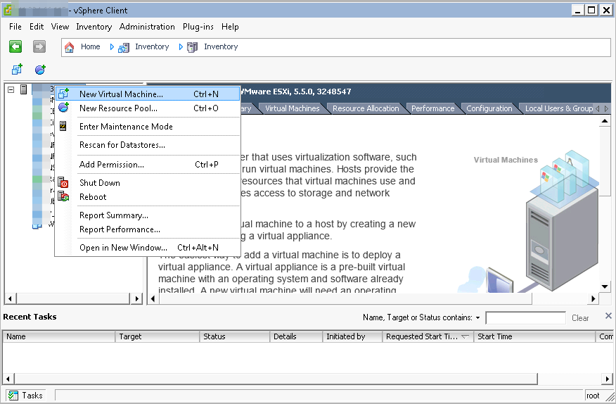 We will use the VMware vSphere client to create a virtual machine. Log in to one of the available ESXi servers using root credentials. First, you will need to upload either the Ubuntu or CentOS ISO to the VMware data store. Then, follow these steps to create the machine: