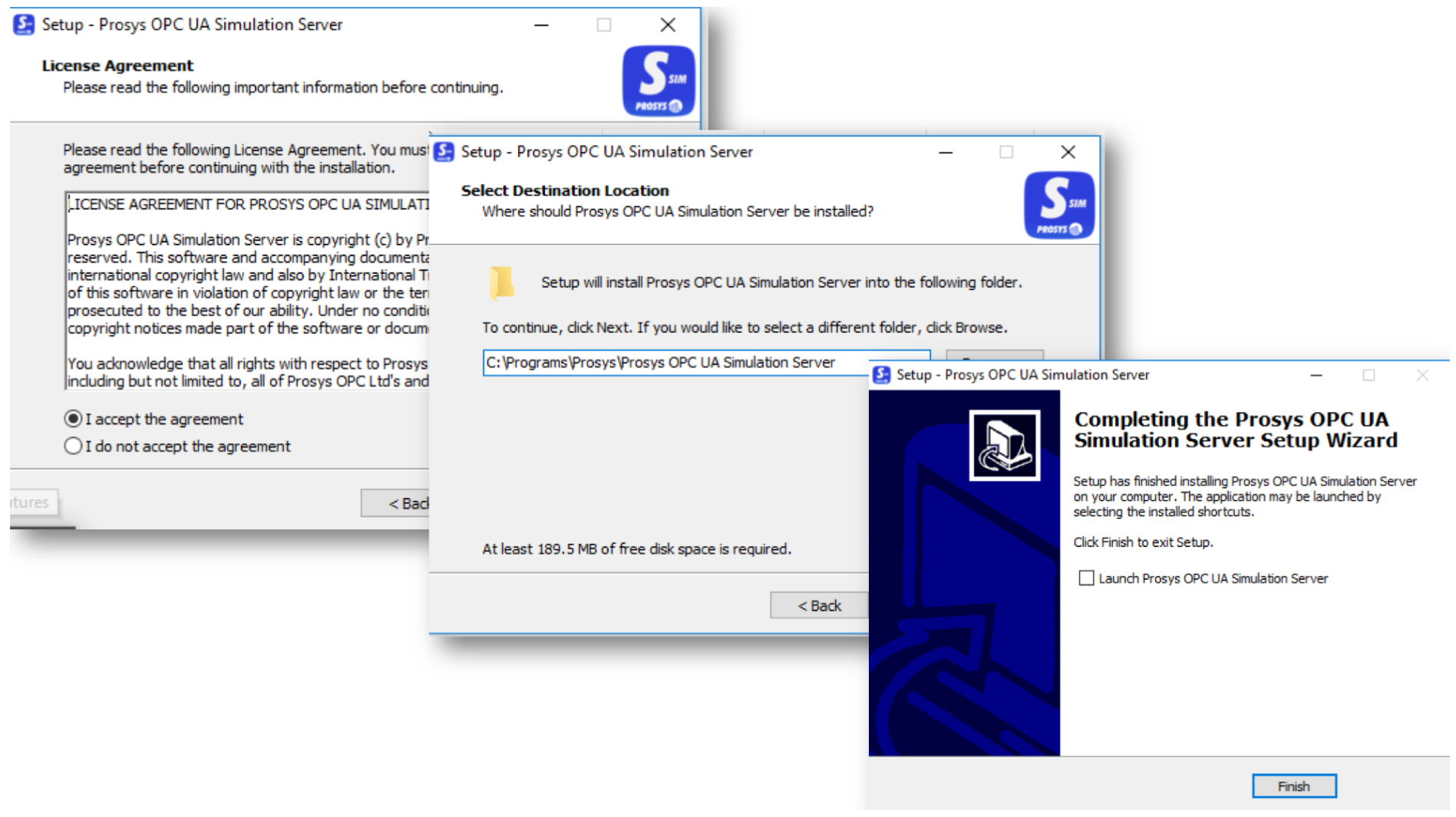 To start the Prosys OPC server, we need to download the package from https://www.prosysopc.com/products/opc-ua-simulation-server/. All we need to do to install the Prosys server is click on the installation package and accept all steps. The three steps are shown in the following screenshot: