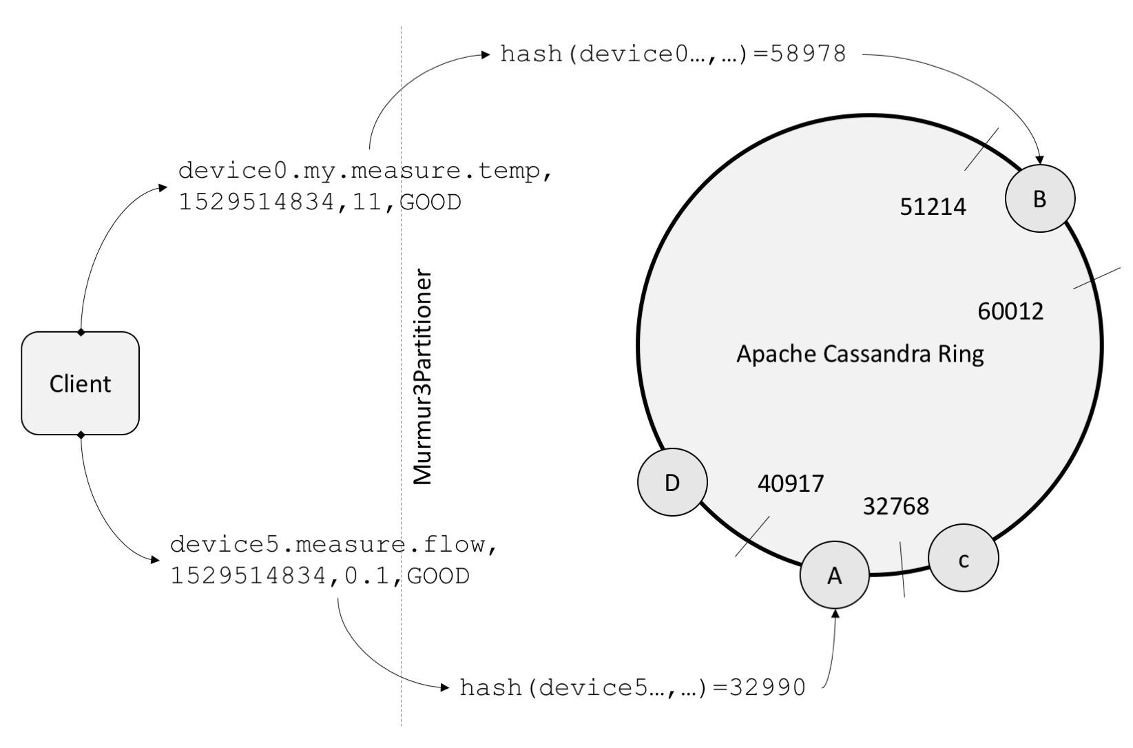Apache Cassandra is organized as a ring of nodes. Each node takes care of a portion of data, according to a hash code that is calculated based on a key. The following diagram shows how a client should allocate the measures across the Apache Cassandra data nodes: